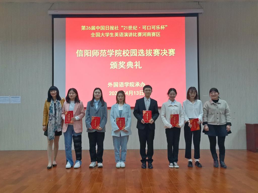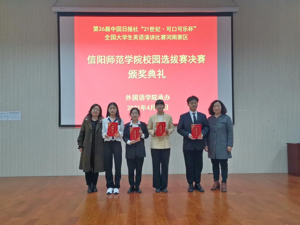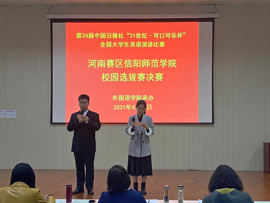 承办的第二十六届中国日报社“21世纪可口可乐杯”全国大学生英语演讲比赛河南赛区信阳师范学院校园选拔赛决赛于人文楼报告厅圆满落幕。 91短视频