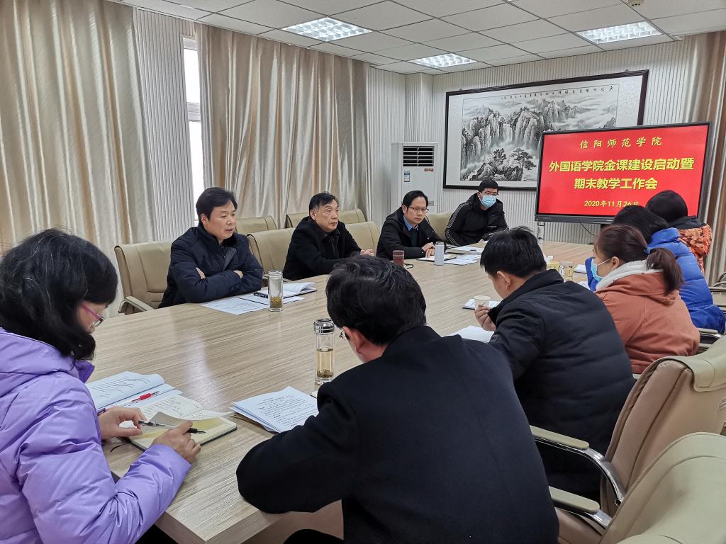 在人文楼五楼小会议室召开“金课”建设启动暨期末教学工作会议,党委书记周学红、院长蔡满园、副院长姚光金、各系主任(副主任)、第二外语教研室主任、教学督导、教学秘书及教务员等参加了会议。会议由姚光金主持。