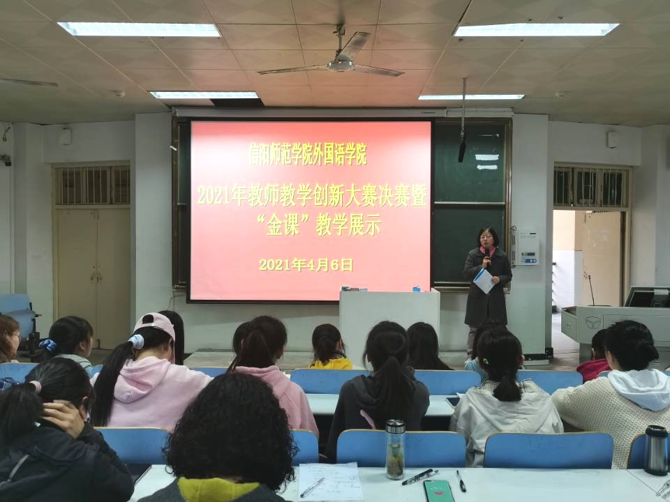 在人文楼308教室成功举办2021年教师教学创新大赛决赛暨“金课”教学展示活动。学院党委书记周学红,院长蔡满园,党委副书记柏孟仁,副院长姚光金,评委余运伟,李明晔,陈顺黎,傅翀,宣军磊,刘海军,任芳、教务办老师们参与此次活动。全体专任教师和部分英语专业学生观摩了比赛。