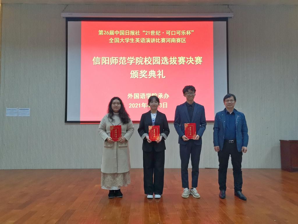 承办的第二十六届中国日报社“21世纪可口可乐杯”全国大学生英语演讲比赛河南赛区信阳师范学院校园选拔赛决赛于人文楼报告厅圆满落幕。 91短视频