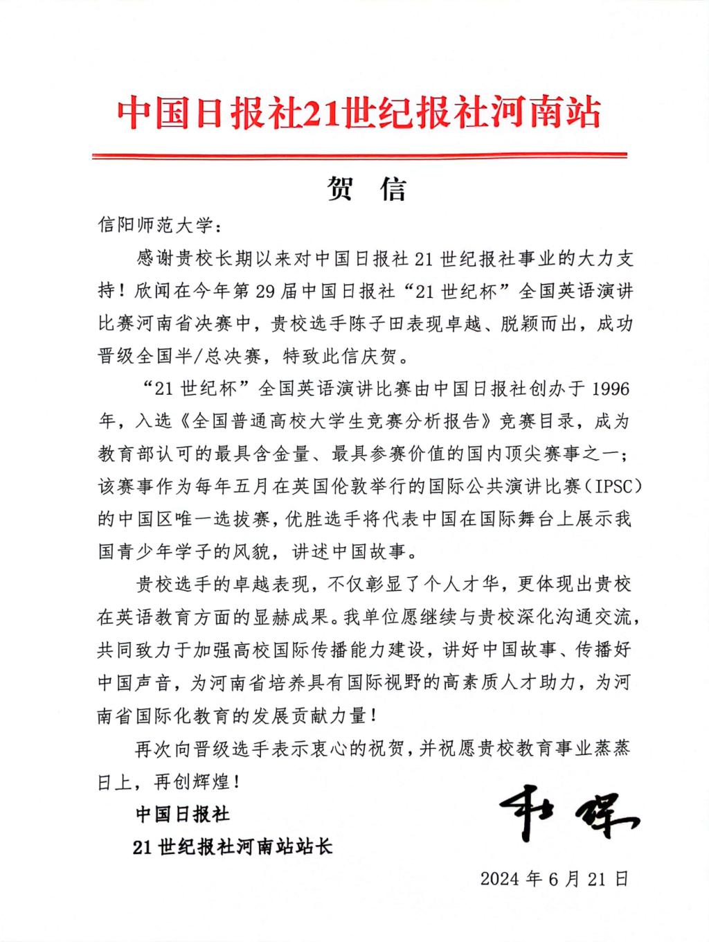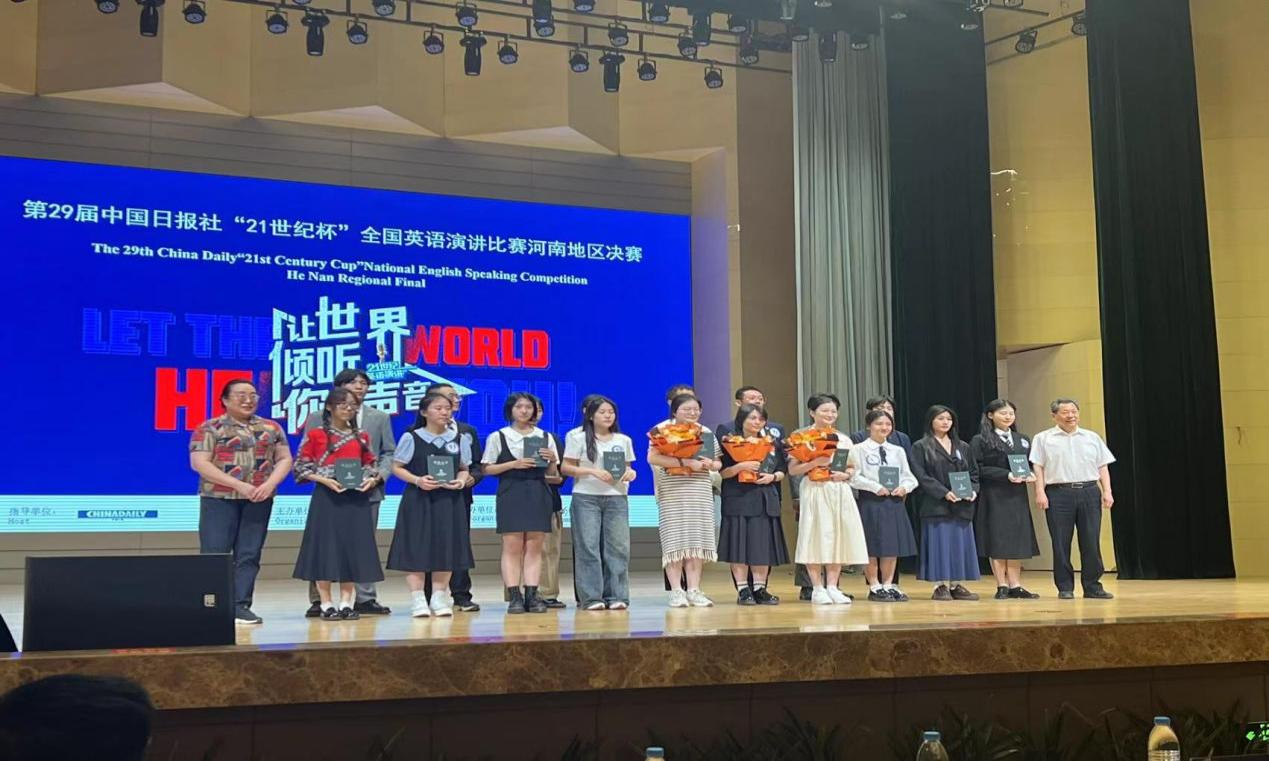 近日,第29届中国日报社“21世纪杯”全国英语演讲比赛河南地区决赛圆满落下帷幕, 91短视频 选手陈子田和李姿在指导教师董新和周雪的精心指导下分别荣获河南省总决赛二等奖和三等奖,陈子田成功晋级全国总决赛。中国日报社21世纪报社河南站为 91短视频 发来贺信,对 91短视频 选手的优异表现给予了高度好评。