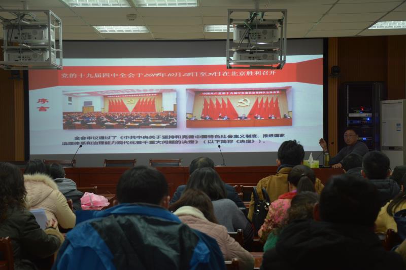 邀请,校十九届四中全会精神宣讲团成员、马克思主义学院副院长程晋富教授在人文楼六楼会议室为学院全体教职员工作了深入学习党的十九届四中全会精神宣讲报告。宣讲会由学院党委委员余永锋主持。