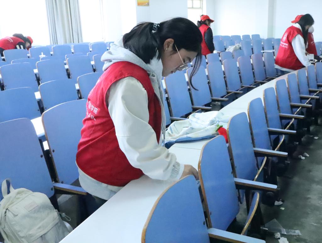 开展“践行雷锋精神 共建美丽校园”文明校园建设活动。通过组织学院志愿者打扫校园卫生、规范电动车停放、清理人文楼教室桌面纸屑等活动,营造干净整洁的校园环境,在日常生活中将雷锋精神内化于心、外化于行。