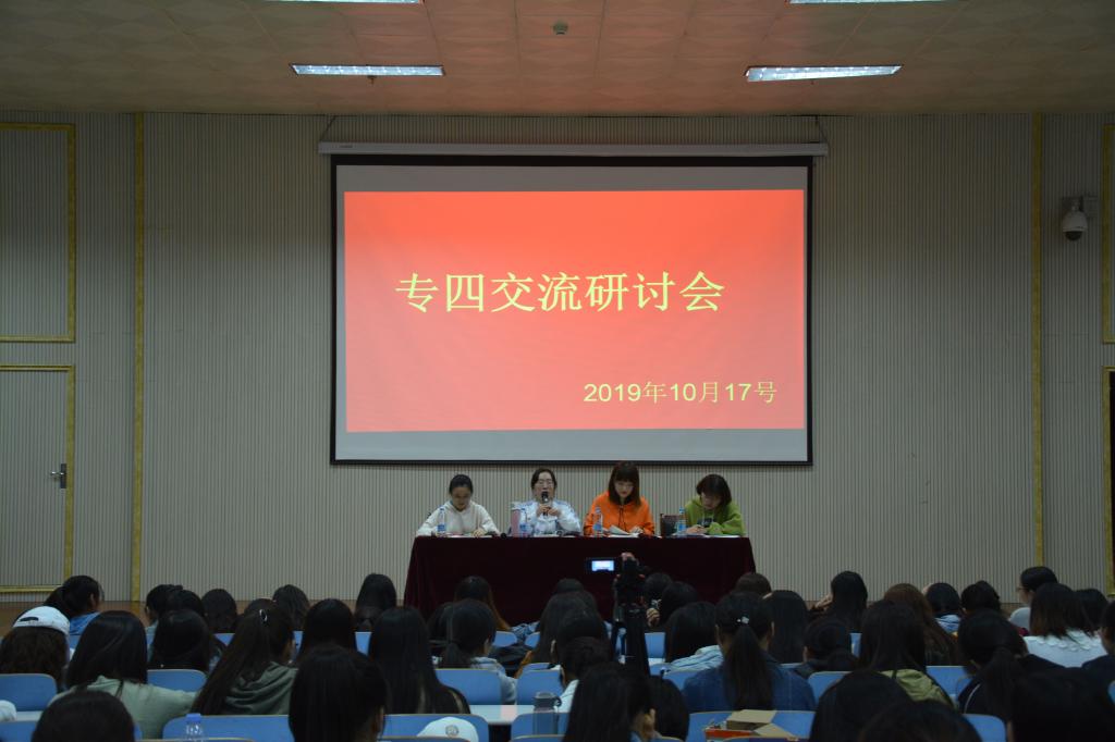 在人文楼报告厅召开专四经验交流会,优秀学生代表李白鸽,王彦淇,姜珂欣,郑玉燕及2018级全体学生参与本次会议。