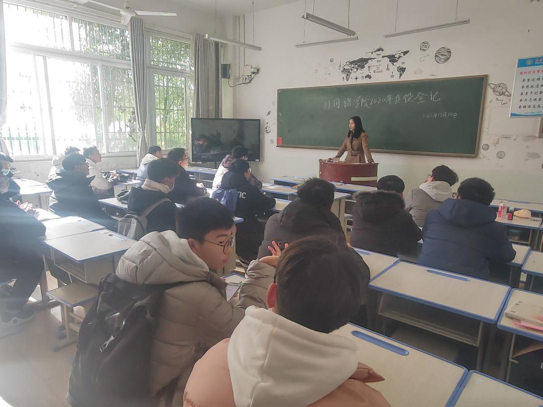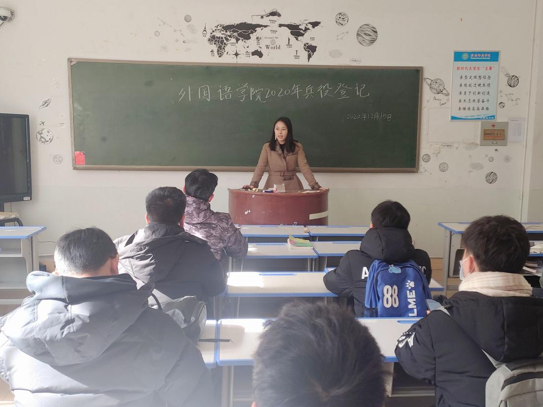 于人文楼101教室召开了兵役登记暨征兵宣讲会,武装干事孙桢桢及2020级全体男生参加此次会议。