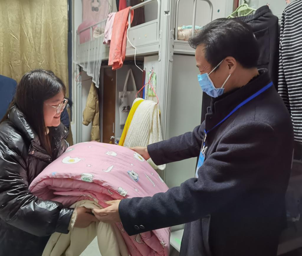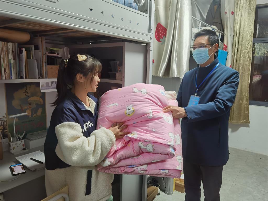 党委书记陈铭,院长蔡满园,党委副书记高彦伟,副院长吴向东、郭敏以及全体辅导员深入学生宿舍,走访慰问学院贫困生,并为贫困生发放爱心棉被。