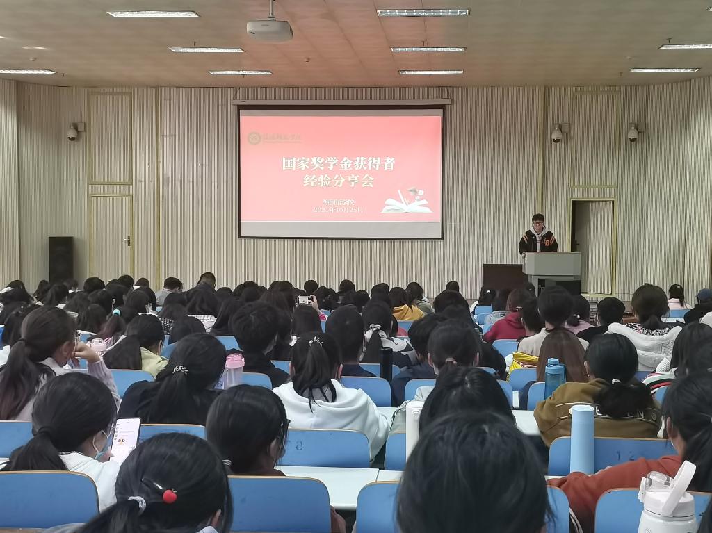 在人文楼报告厅举行国家奖学金获得者经验交流分享会,党委副书记高彦伟、资助专员孙桢桢、2021年国家奖学金获得者以及2021级全体学生参加了分享会,会议由孙桢桢主持。