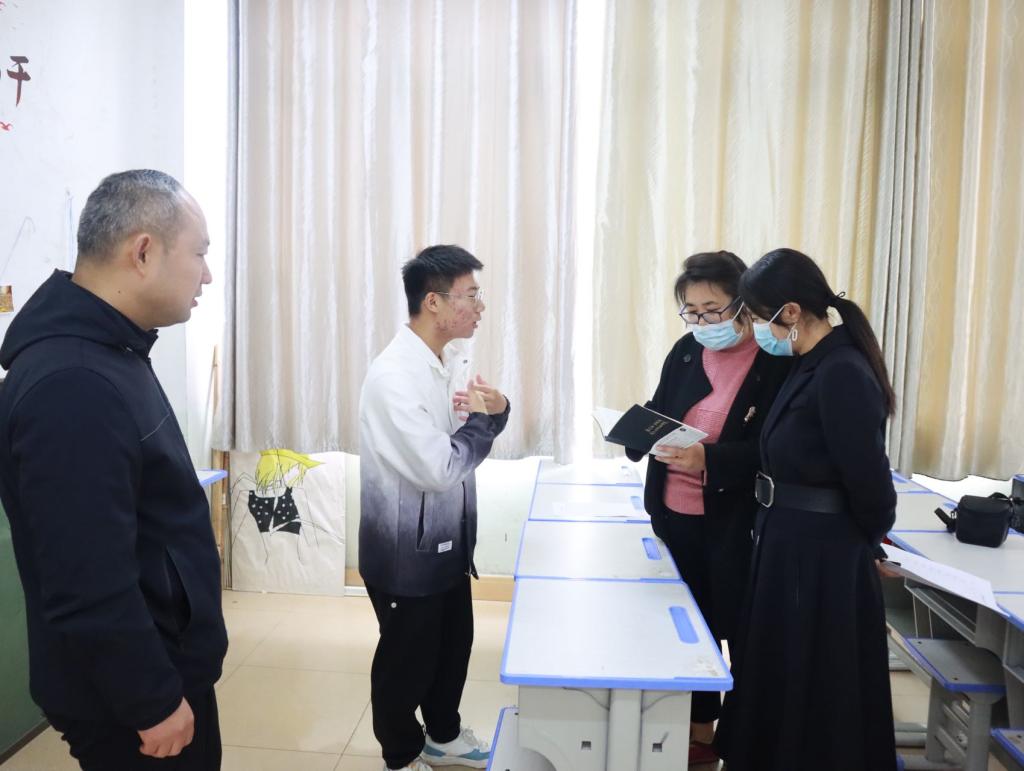 孔宪巍、黄艳文和郗金月老师对各班设计的心情墙进行参观指导。