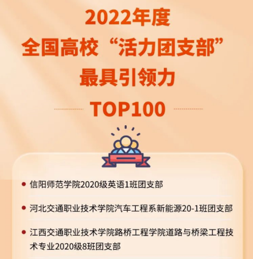 全国高校“活力团支部”风采展示活动旨在深入贯彻“全团抓思想政治引领”“全团大抓基层”“全团抓学校”工作部署,落实《关于改革创新高校共青团工作 切实增强思想政治引领实效的若干措施》有关要求,激发高校团支部活力,通过新媒体方式集中展现高校团支部改革建设成果和典型经验。本次评选活动自2022年5月启动,经学院推荐、校级选拔、省级展示、全国展示等环节,从引领力、组织力、服务力、贡献度、改革味、好作风6个方面评选出2022年度全国高校“活力团支部”六个类别TOP100榜。