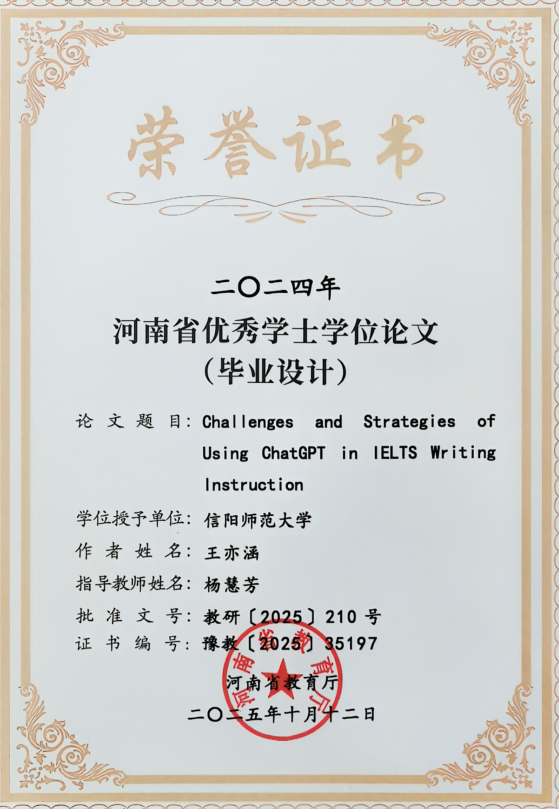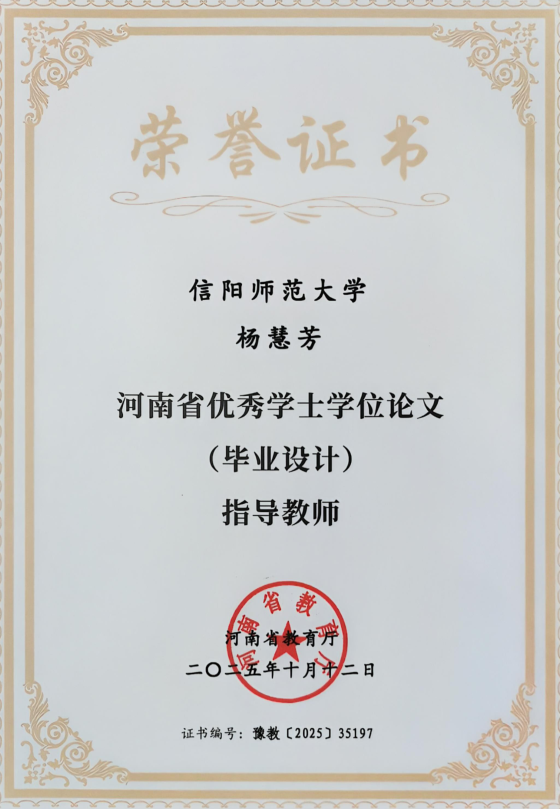近日,河南省教育厅发文(河南省教育厅教研[2025]210号)公布2024年全省优秀学位论文评比结果。91短视频 杨慧芳老师指导2020级英语专业王亦涵同学完成的本科学位论文被评为“优秀学士学位论文”。