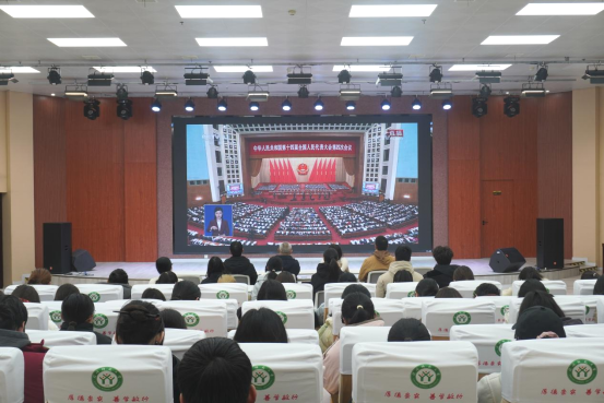 组织师生代表在五育大讲堂集中观看2026年全国两会开幕会直播,学院党委副书记高彦伟、教师代表、专兼职辅导员及100余名学生代表参与活动。