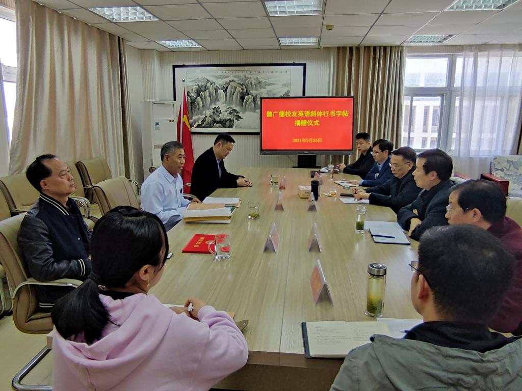 捐赠仪式上,魏广德校友向学校捐赠了“英语斜体行书字帖”2000册。魏广德对母校与老师们的悉心栽培与关心帮助表示感谢,表示今后将继续秉承“厚德崇实,善学敏行”的校训,擦亮师院名片,传承师院精神,为母校的教育事业发展贡献自己的一份力量,并对母校未来的发展致以美好祝愿。