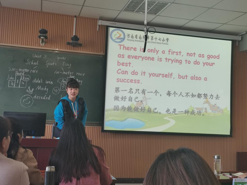来自信阳市浉河区胜利路小学的张永军老师、商城五小的余尚翠老师、南阳市十七小的陈晨老师、方城县第三小学的顾蕴老师,分别选择小学英语教学中最常见的听说课、词汇课、读写课等课型,以形式各异的导入、环环相扣的教学设计、自然流畅的课堂组织、轻松愉悦的师生互动、及时到位的课堂评价、拓展迁移,赢得了师生的一致好评。