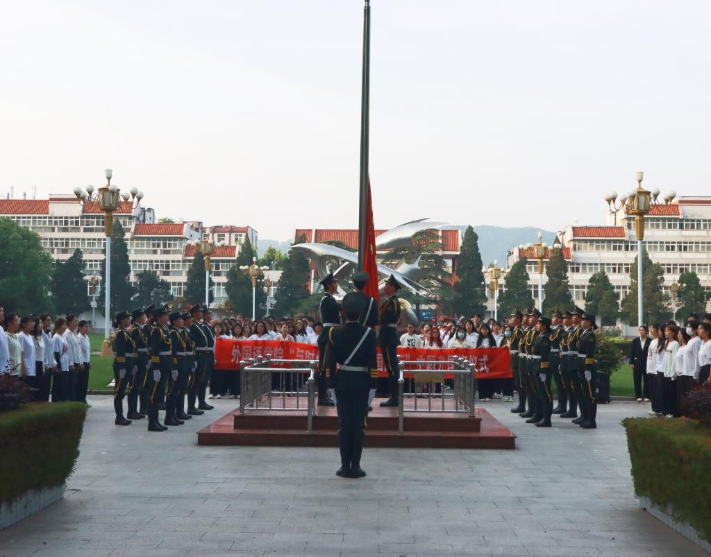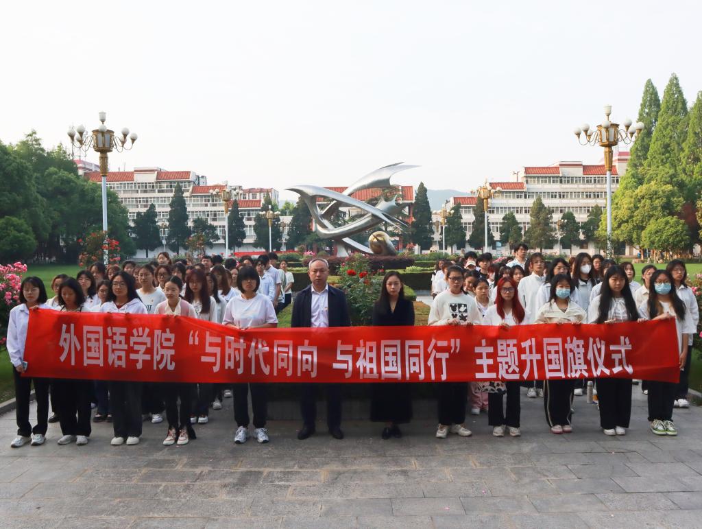 在明德广场举行“与时代同向 与祖国同行”升国旗仪式,学院党委副书记高彦伟、武装干事孙桢桢以及2023级全体学生参加仪式。