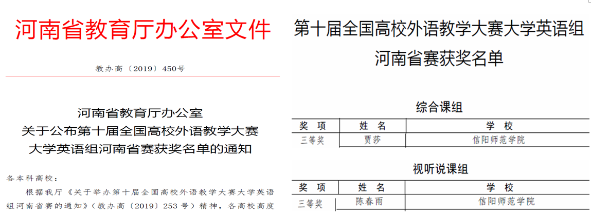 近日,第十届全国高校外语教学大赛大学英语组河南省赛落下帷幕。我部选送的贾莎、陈春雨两位老师分别获得大学英语综合课组、视听说课组三等奖。