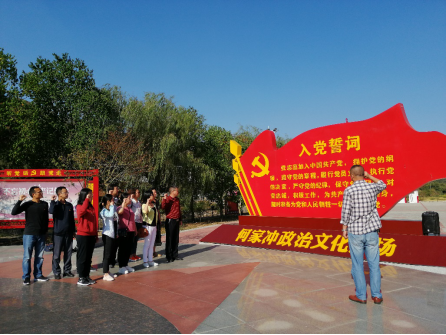 在何家冲政治文化广场前面教工第一支部党员举起右手重温入党誓词接受革命传统教育。
