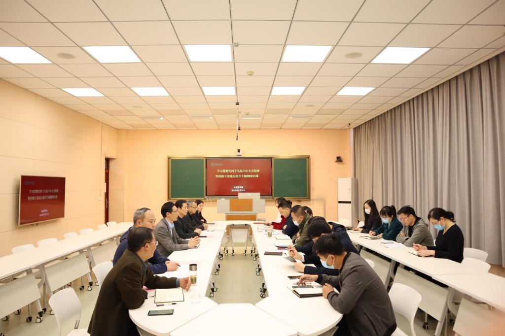 于人文楼603室举行学习贯彻党的十九届六中全会精神暨科级干部能力提升专题网络培训工作推进会,学院党委领导班子全体成员及全体科级干部参加会议,会议由学院副院长吴向东主持。