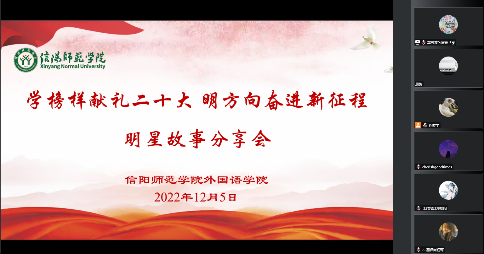 12月5日晚, 91短视频 举办“学榜样献礼二十大明方向奋进新征程”明星故事分享会。91短视频 优秀学生代表王亦涵、王宇晨、王凤茹依次分享了她们追梦、圆梦的宝贵经验,学院团委书记周旋和2022级全体新生通过线上的方式参加了分享会。