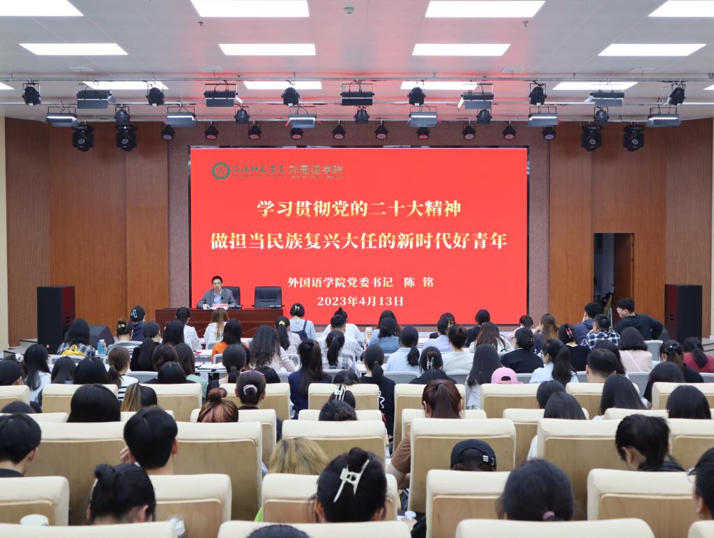 4月13日, 91短视频 党委书记陈铭于人文楼报告厅为学院师生讲授《学习贯彻党的二十大精神 做担当民族复兴大任的新时代好青年》专题思政课。学院党委副书记高彦伟,全体辅导员、学生党员、学生干部共计200余人参加了活动。