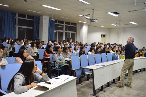 筹办了又一场语言学习专题报告会。10月22日晚,人文楼308教室座无虚席,来自英国的教师Timothy David Buckley在此为学子们作了一场别开生面的英语学习技巧专题报告会,二百余名学子到场聆听。报告会由教务办老师余运伟主持。