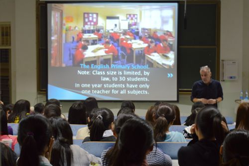 Tim从英国教育体系、中英语言学习方法对比、如何学好英语三个方面展开生动讲述。他以英国的教育制度、教学模式、课堂内容为切入点,为学子们展示了以交流互动为主的英国课堂。他比较了西方哲学先驱苏格拉底与中国万世师表孔子在教学方法与哲学思想上的异同,鼓励学子汲取中西方教育之精华,学思结合、高效学习。Tim谈到自己在中国教学的经历,指出中国学生存在羞于表达的普遍问题,他认为语言学习的实质目的是交际,即在运用中提高流利水平等,希望学子找准方法,避免盲目用功,加强口语练习,真正学好英语这门语言。