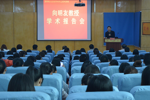 向明友教授分别从研究目的、基本概念、纷争所在、sort of案例、问题的解决、结论与启示六个方面为学子展示科研过程。向教授首先回顾了语言学的发展历程,用通俗易懂的语言解释语用化与语法化的概念,阐述了语言学的研究在英语教学中的重要作用。随后,他通过类比身边小事为大家阐述了语言学的魅力,深入浅出的讲解,让大家对语言学中的语用学和语法学有了进一步的认识。同时,他诙谐幽默的语言、独到的见解、清晰的思路、开阔的视野都深得大家喜爱,使得现场掌声连连。